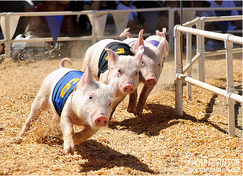 The pig is a remarkable animal, and perfectly suited to domestication: they are quite intelligent and learn tricks faster than dogs. Pigs swim just fine and would eagerly prefer water to mud. They run at speed 11.5 mph (almost 20 km/h!). We just need to make them ride a bicycle and they can do triathlon.