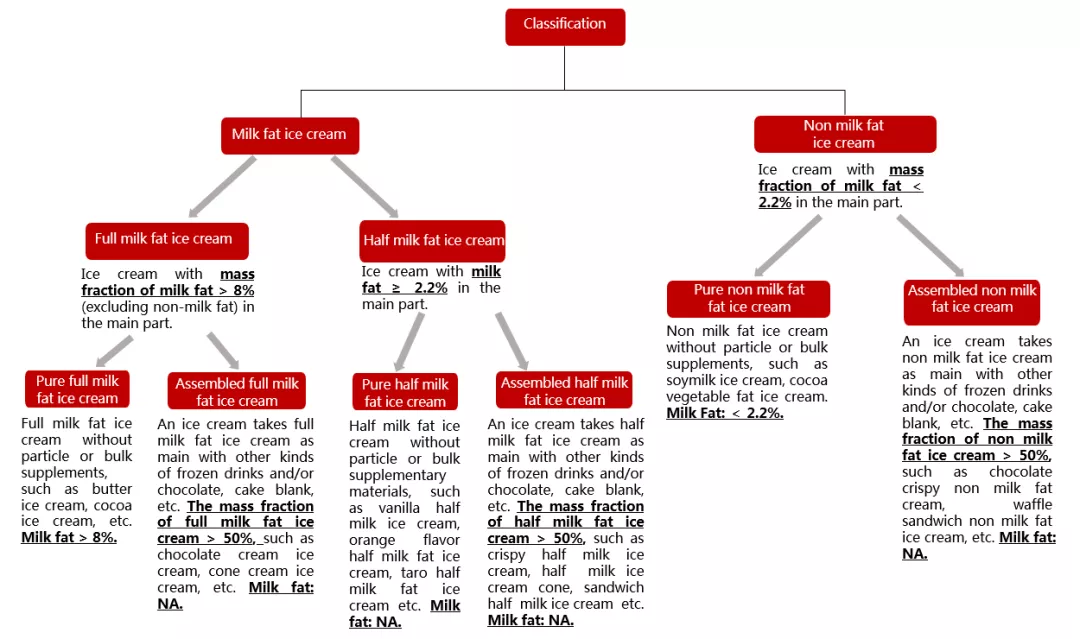 The key word in above definition is Milk Fat, which refers to the fat derived from milk, and it is also the key in the classification of ice cream. In addition, any ice cream product that meets the definition of certain ice cream product type in above classification can be classified into that ice cream product type. Ice cream products produced and sold in China shall be classified into a certain ice cream product type according to its ingredients and process and the definition of classification in the national standard. Ice cream product type shall be listed clearly and correctly on the labelling of the ice cream product.