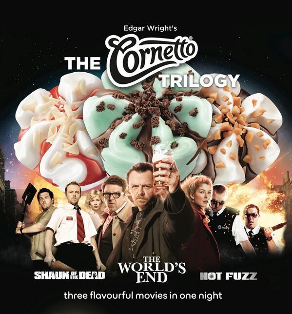 它非常受欢迎,有一部由Edgar Wright执导的Cornetto Trilogy电影系列:三部曲中的每部电影都与电影中出现的特定Cornetto风格有关。 事实上,在Cornetto作为第一部电影中的宿醉治疗被引用之后,演员们免费获得了Cornetto,而导演则试图再次拍摄第二部电影时,他失败了。 但是,Cornetto仍然出现在第三部电影中。