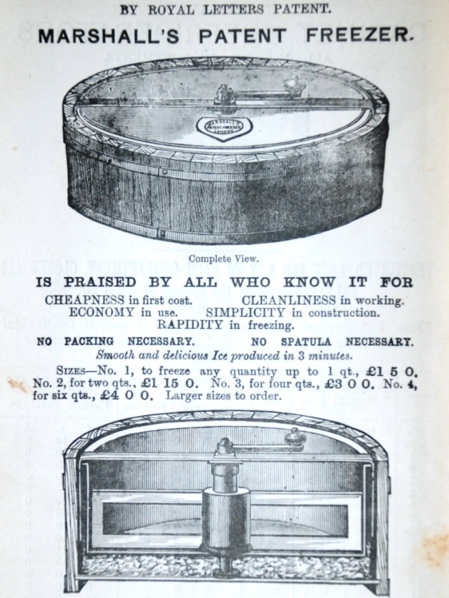 第一个“奶油圆锥形蛋筒”,可能是最早出版的食用冰淇淋蛋筒,被纳入1888年由艾格尼丝·马歇尔出版的一本书中,被称为“冰女王”,因为她的冰淇淋和 其他冷冻甜点。 她还于1885年申请了冰淇淋机专利。