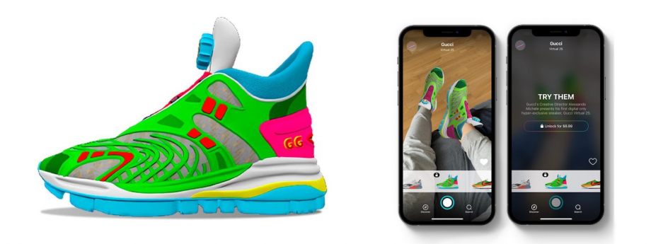 RTFKT, a virtual sneaker company, designs entirely digital products that can be purchased as NFTs and “worn” using a custom Augmented Reality filter.