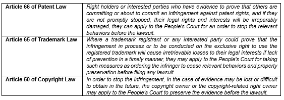 As the issuance of “Provisions of the Supreme People's Court on Several Issues concerning the Application of Law in Examining Cases Involving Act Preservation in Intellectual Property Disputes” on December 12, 2018 and later taking effective on January 1, 2019, it provides a clearer legal basis for the implementation of preservation in IP disputes.