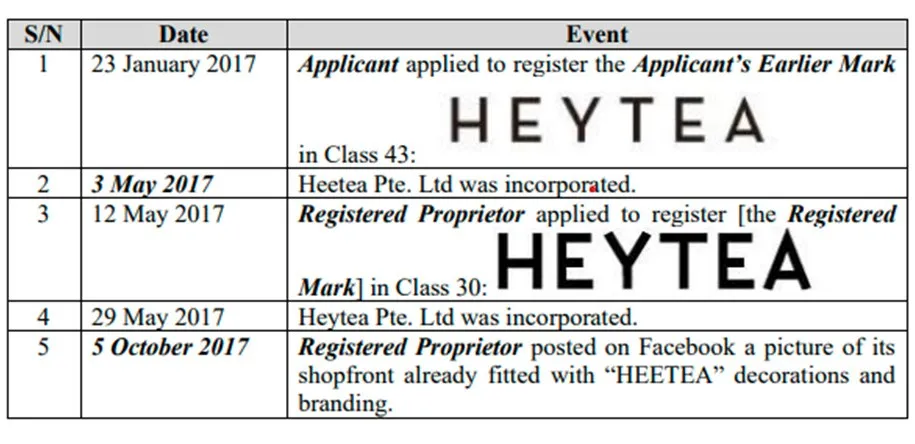 Thirdly, Meixixi argued that the counterpart trademark had been applied for in bad faith. The Hearing Officer held that the chronology of events, including HEETEA setting up a new business entity called HEYTEA Pte Ltd., suggested that the counterpart had registered their mark in bad faith, simply to hold the Applicant ransom or to disrupt their business.
