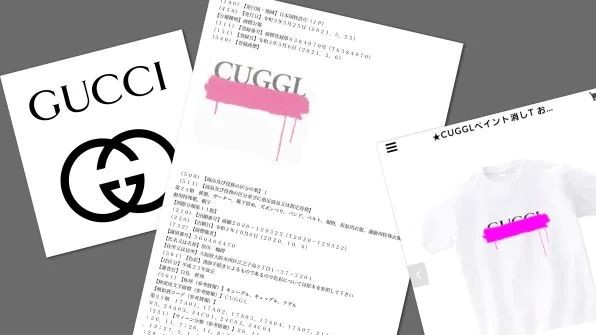 In October 2020, Nobuaki Kurokawa, an Osaka-based entrepreneur who sells t-shirts parodying famous brands, filed the trademark application for “CUGGL” with a hand-painted line in pink, for use on clothing, footwear, headwear, and apparel in class 25. See herein the specimen.