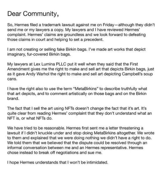 Rothschild, instead, made a statement claiming that the designs of METABIRKINs are simply a creation of art.