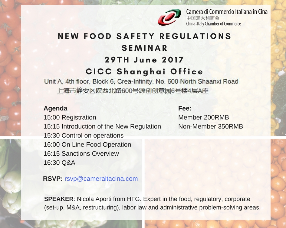 Mr. Nicola Aporti - Head of Corporate and Food Regulatory - will be a speaker at the New Food Regulations in China seminar, organized by China-Italy Chamber of Commerce on June 29th, 2017.
