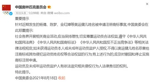 On August 18, the Chinese Olympic Committee published important tips on its microblog, and issued important news on the recent malicious application for trademark registration of the names of Olympic athletes.
