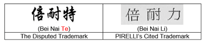 The Disputed Trademark 倍耐特 (Bei Nai Te) is similar to the cited trademark 倍耐力 (Bei Nai Li) in terms of word component and pronunciation. The Disputed Trademark constitutes the copy and imitation of the cited trademarks.
