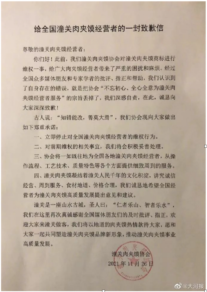 The Association was born in 2016 and it is actually registered in the city of Tongguan. The Association has filed and registered the trademark “潼关肉夹馍” (No. 14369120) and based on such trademark raised hundreds of litigations with the aim of collecting damage compensation. What’s more, if the sued stores still want to use a name containing Tongguan Roujiamo, according to the claims of the Association, they shall pay royalty for trademark license and subscribe to join the Association.