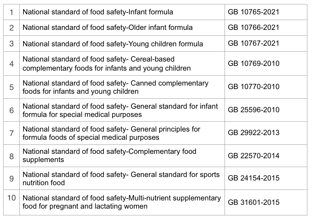 The third category is special dietary food standards, which is used for specific consumer groups such as infant formula and other special food. Relevant national standards shall be abided by. There are 10 standards in total.