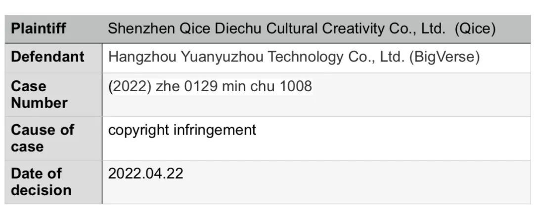 Qice sued BigVerse in Court and argued that as a professional NFT platform, BigVerse should bear the duty of prior examination of potential IP infringement on NFT digital works published on its platform and not only the obligation of "notice-deletion" afterwards.