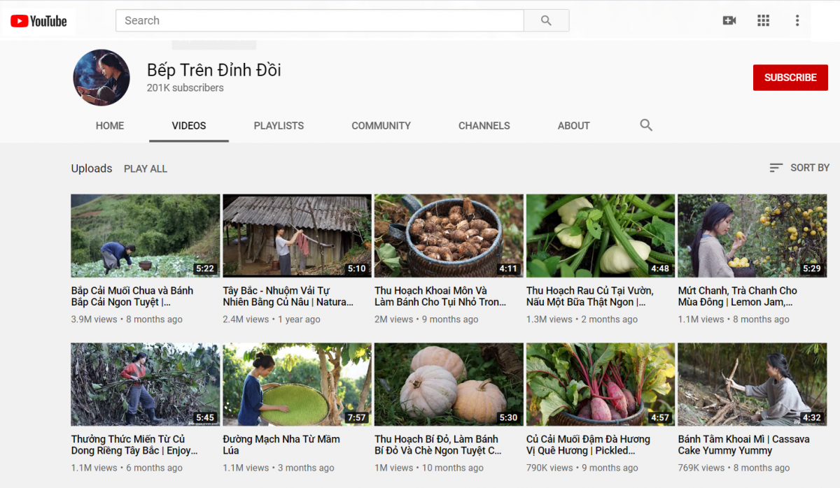 So far, her YouTube channel, Bếp Trên Đỉnh Đồi (Kitchen on the Hill), has accumulated around 201,000 subscribers. With 8 videos recorded over 1 million views (the highest number of views is close to 4 million), the Vietnamese vlogger is no doubt a new hit, or in Chinese, a Wang Hong (internet celebrity).