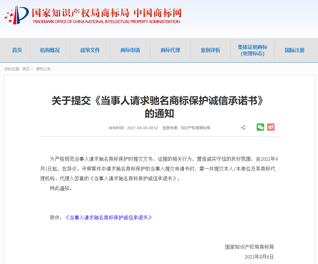 As stated in the notice, the signing of Letter of Good Faith Commitment is in order to “strictly regulate the relevant acts of parties submitting documents and evidence when requesting well-known trademark protection”.
