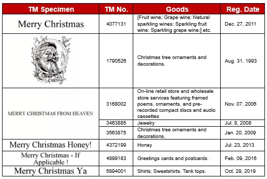 Through the trademark database of USPTO, as we can see, “Merry Christmas” per se is trademarked on fruit wine etc. Combining with some simple descriptive words or design, they also could be trademarked, even on Christmas type of product. To be honest, the result surprised me a little. Usually, when we say “Merry Christmas” , it’s merely to convey the sentiments, not to function as a source indicator. Therefore, even these marks are protected in US, it is noteworthy not to be a Grinch!