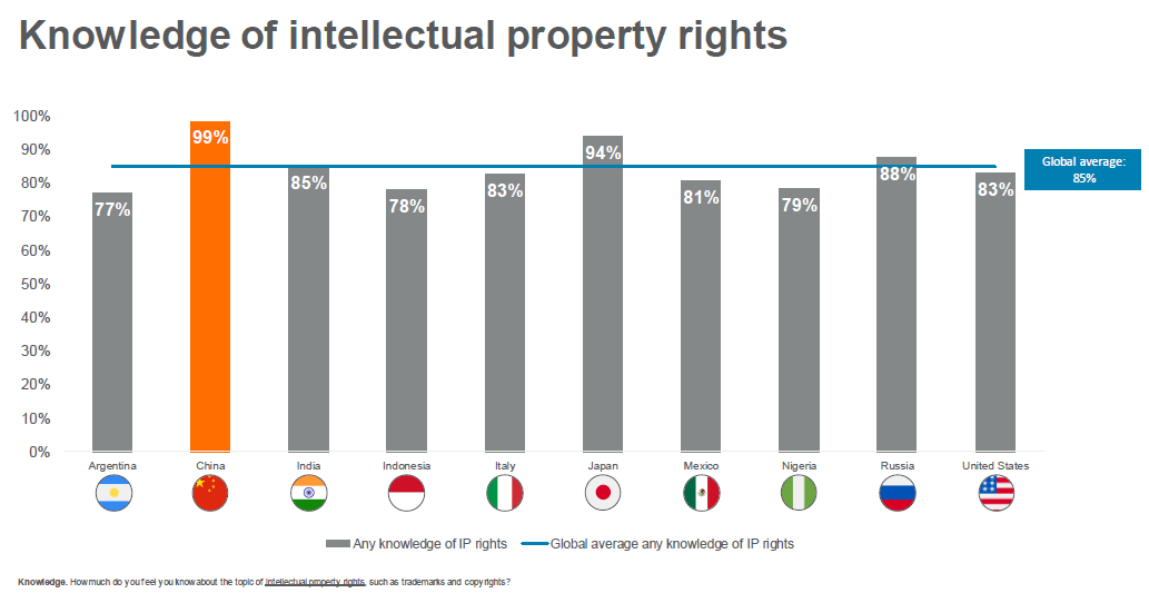 比方说,调研显示,99%的Z世代中国人具有知识产权相关知识,在10个被调查国家中国位居第一。日本是另一个对知识产权有较强意识的国家,该比例到达94%。