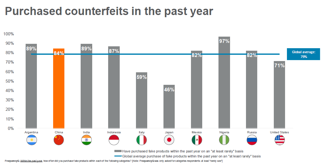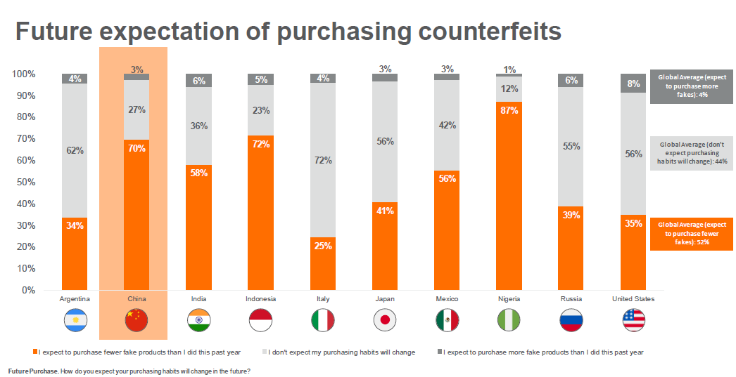 如果就中国年轻人购买假冒产品的可能性来看,他们在十个国家中位居第五。84%被调查对象承认他们在过去几年间购买过假冒产品,而超过70%对象表示他们将会再次购买假冒产品。