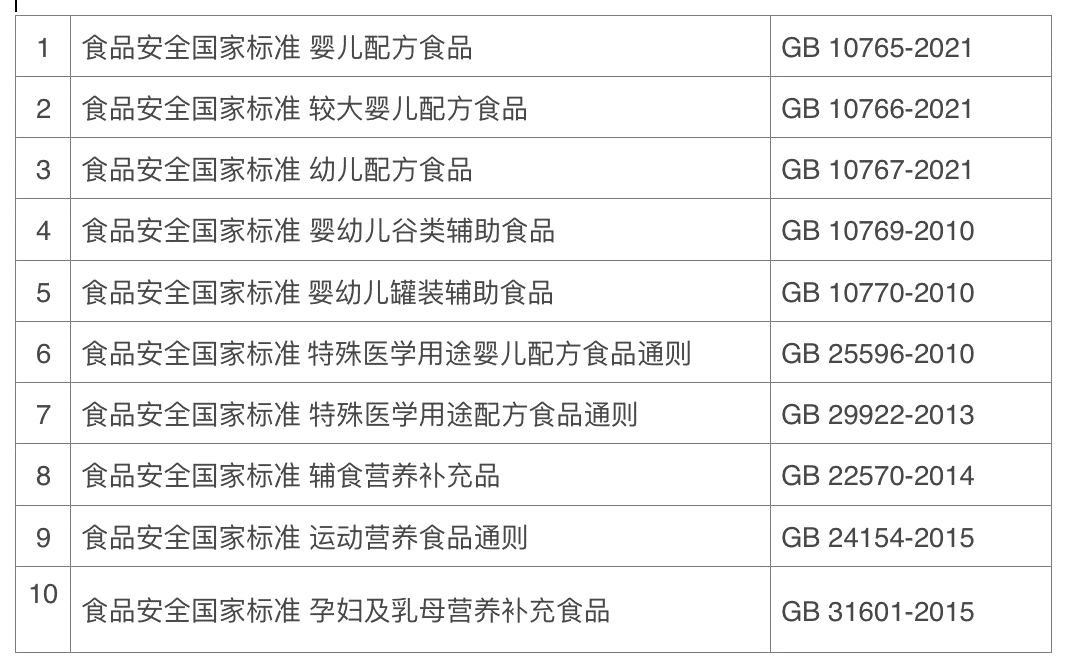 用于特定消费人群的食品,例如婴幼儿配方等特殊食品,必须符合其相关国家标准。该类标准共10项,包括: