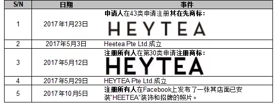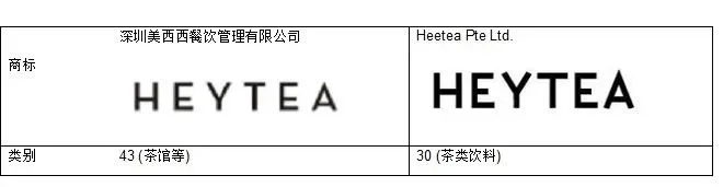 在经过原始名称(皇茶)的第一次纠纷之后,2019年,美西西不得不在新加坡面对新的挑战。一家名为Heetea Pte Ltd.的公司2017年在第30类(茶类产品)中提交并申请注册了HEYTEA商标,而美西西只在第43类(茶馆)中获得了HEYTEA商标的注册。