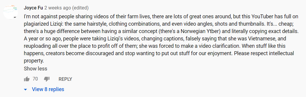 然而,会发光的不全是金子。该越南博主的视频底下中充斥了指控她抄袭中国网红李子柒的评论。有网友在她观看量最多的视频之一的评论中指出,该越南博主“全盘抄袭”了李子柒。