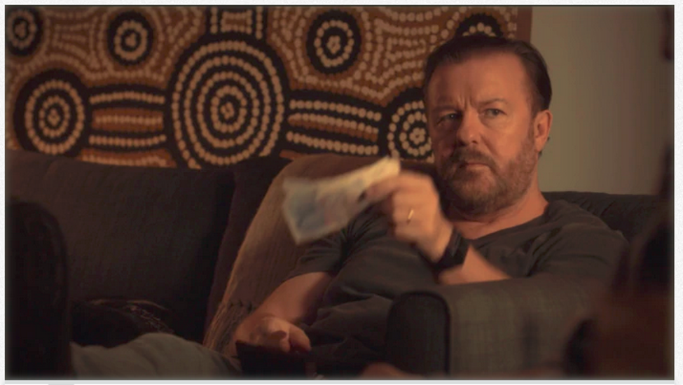 瑞奇·热维斯(Ricky Gervais)饰演托尼(Tony),在Netflix系列电影《身后事》中坐在仿造原住民艺术品前。(Netflix)